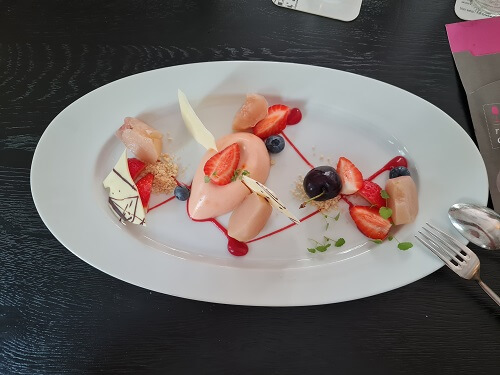 - My desert, peach and strawberries.