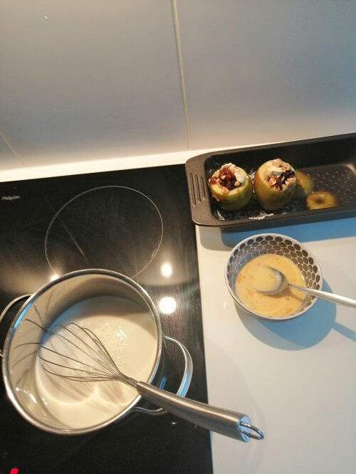 - Making desert, vanilla sauce and apples with nuts honey and raisins in the oven.
