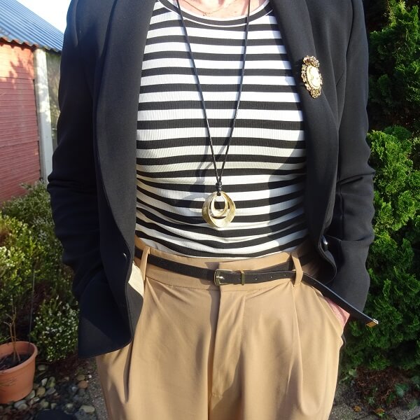 To lift the casual look of the sneakers a bit, I wear a blazer with a brooch on it. And to break the whole outfit, but keep the relaxed look, I wear a Breton stripe sweater underneath. I think there is nothing boring at all with these beige trousers.