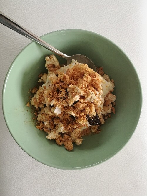 This dessert doesn’t look special or anything, I actually wanted to try it out before I serve it to any guests. So hence not in a nice bowl and not nicely laid out. But it is sooo good! What do you need? A piece of nougat, amaretto biscuits, meringue, dark chocolate, vanilla ice cream and espresso. Crumble everything fine. Put a cup of espresso in a dessert bowl, or glass, then a scoop of ice cream and then sprinkle the rest over it. Delicious!