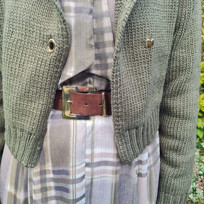 I wear leggings underneath and two basic shirts and a warm cardigan over it, because otherwise it is way too cold for me! The checkered dress is belted with a cool leather brown belt with golden buckle. And also the buttons on the cardigan are gold which compliments the gold thread in the dress.