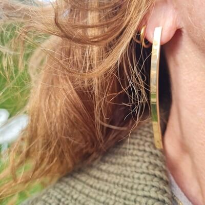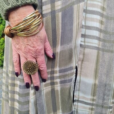 The bracelet brings back the brown in the outfit and a statement ring from Lewes is a pre loved one. And simple golden earrings. By the way, I now remember that I also have this checkered blazer in my closet…..so two items. Can’t wait to wear this dress more, also with these fabulous boots. For a sitting party…