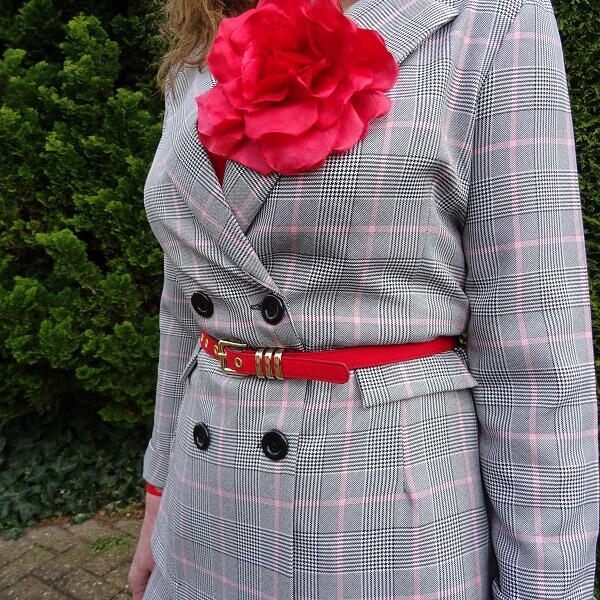This is beauitful on you! I love the plaid with the red. The flower is such a great shot! I love it as a brooch or added on the belt. You look great!! I love a plaid suit. I have been thinking of you and I know this is tough!