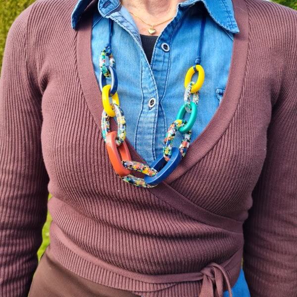 What a yummy shade of chocolate! Love the boots and the denim top. Fun, fun necklace!