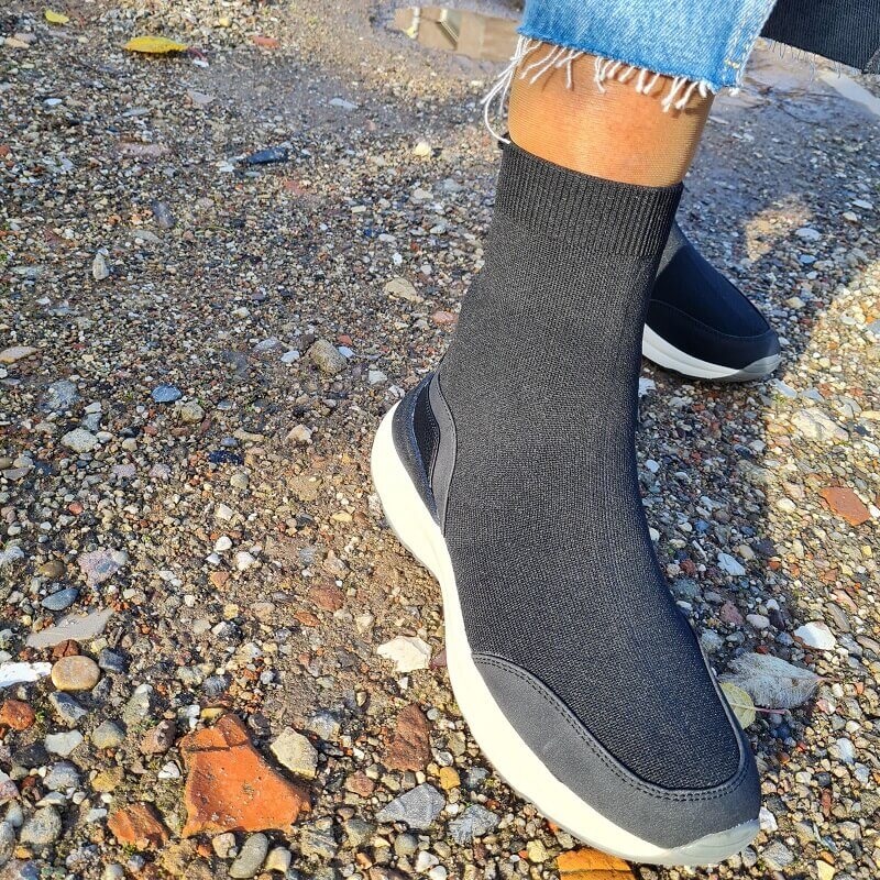 A trend of this season is to wear the denim maxi skirt with high boots. With a heel. And let me have those. Years ago I invested in beautiful leather classic boots. A brown and a black pair. I don’t wear them often, but they never are out of style and are very elegant and classic. And they now look beautiful under this skirt. But I went now for these fantastic sneaker ankle boots sock boots whatever you call them.