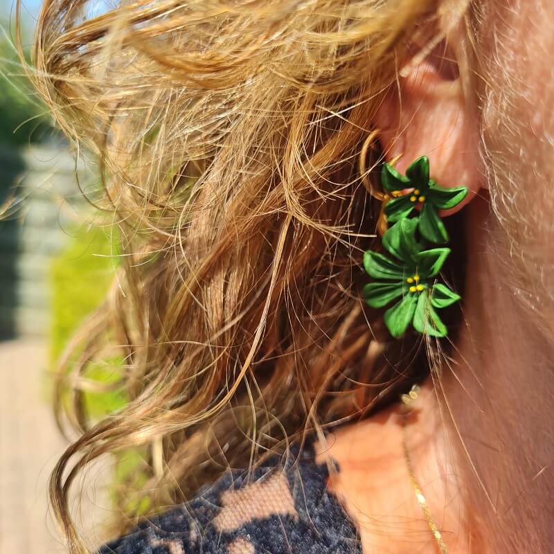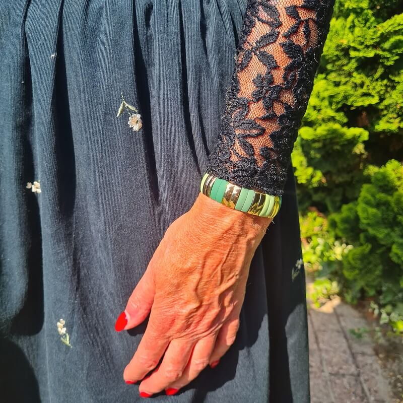But a lot of different textures in one outfit! To accentuate the green in the skirt, including the leaves of the daisies, I wear green flower earrings and a green/gold bracelet. I talked a few weeks ago about fillers for sagging earlubs. I asked at the clinic, but it was not for that. They do surgery to fix sagging earlubs though. Have to think about that…..I guess that would be very expensive. And they didn’t think I had very sagging earlubs. But I feel they are and I find it very ugly. I just miss my statement earrings!