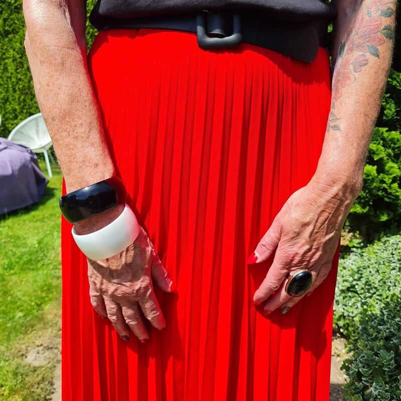 White sneakers because I wanted to wear sneakers under this skirt. The colour combination is not perse a favourite of mine. Red is not even a colour I like to wear. But I have my (colour) moments. Still, when I wear colour I like a monochrome look the best. I love the earrings I am wearing here, so super summery. And black and white bracelets that are very very old. One new item, very frugal for a fashionista!