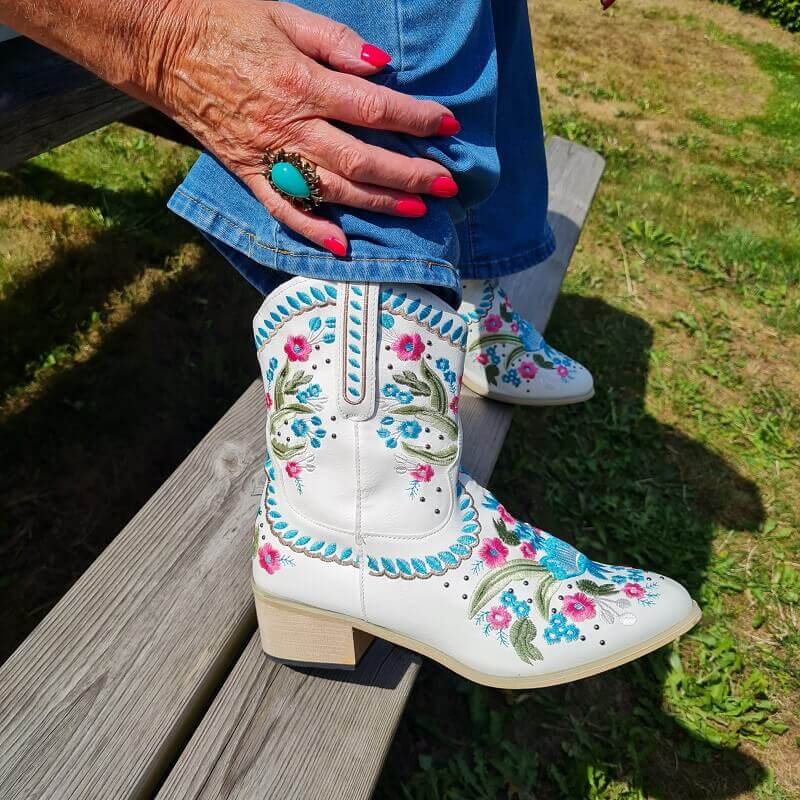 OMG, Nancy! You look absolutely amazing in this outfit. Sexy in fact! The jeans are such great fit, and that tee shirt is so pretty, and a great color on you. I love the white accessories. As for the embroidered boots, I’d wear them in heart beat. They are fabulous!