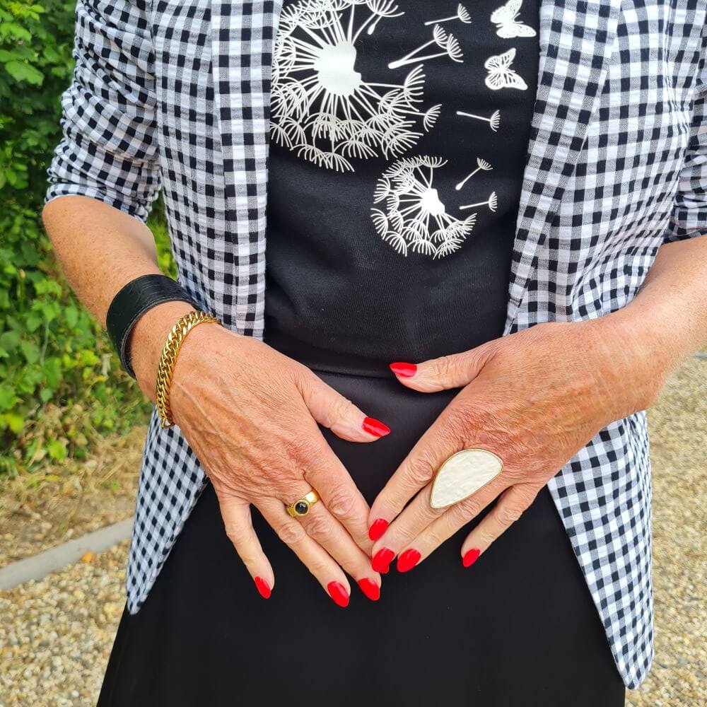 Although a bright yellow tee would look fabulous with black and white. (I think I might stroll Vinted for a yellow top) I know that any colour looks good with black and white, I just don’t like it that much. The black leather bracelet is so old that it is starting to crumble a bit. Such a shame, because I think it’s so beautiful and cool. It’s a crocodile print. Well, another excuse to look for a new one. I am wearing a gold bracelet from this collaboration and a statement white ring. The espadrilles are a fabulous buy! They look good under everything and are comfortable.