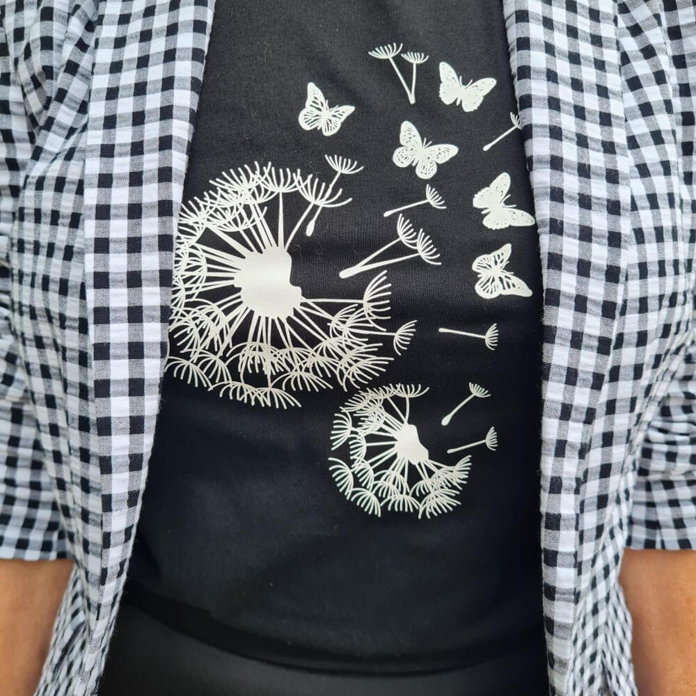 So I wanted to wear the forgotten gingham blazer, along with the silky Marc Cain skirt. This skirt, among many other items, were gifted to me for a television programme. And what fits better with the blazer and skirt then this lovely butterflies and flowers tee. I think it’s a really nice combination. All the more so because I’m very much into matchy matchy. And I’m not a big fan of adding color to black and white. I bought this blazer on Vinted with trousers, and it was sold as a suit.
