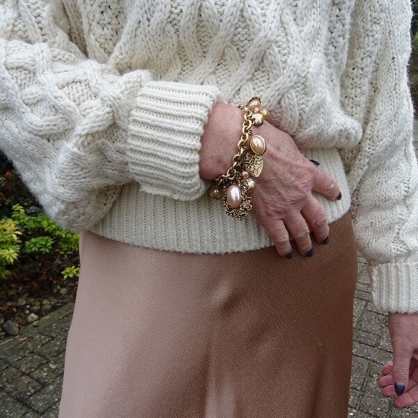 Today I show you a style steal. I showed it on the anniversary of The Good Buy/Good-Bye Book. What fun it was to do that theme! So nice to see how all the ladies were inspired by another blogger! I am wearing this silk skirt, that actually was a bad buy because I am not sure I actually like the color. But I wear it with a warm sweater and a owl brooch and a charm bracelet.