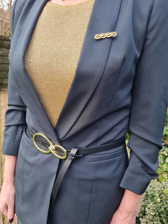 I think this glittery gold top looks great on this green skirt with a very dark green blazer. It’s a pitty that the blazer is such a dark green that you can hardly see that in the photo. I don’t like long sleeves at all, so I often look for jackets with this sleeve length. Of course I had to wear these ankle boots, first I thought it would be to much, but I love it. I added a small golden brooche that I bought at the same vintage shop and I belted the blazer.