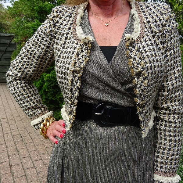 So, actually this seemed like such a simple dress to me, but it isn’t. I can’t wear too many accessories because then it quickly becomes way too much with that gold and silver. I don’t really like adding a color. Should I leave it with just the dress and ankle boots? No, I added this lovely short jacket that also has a bit of gold in it! This is the best option for me. No statement jewelry, but cool boots. And that cool jacket.