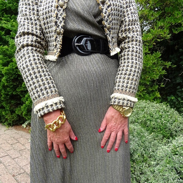 I’m hearing you on your dilemma, Nancy. I think metallics are very tricky to combine with other colours. Apart from a silvery Lurex jumper, I don’t have any metallics in my wardrobe. If I were to style that dress, it would be a lot of trial and error, which might result in colour combination I’ve yet to think of. But I do love the look you came up with, Nancy. I love how you opted for the black belt and that dress and cropped jacket look like they were made for each other! xxx