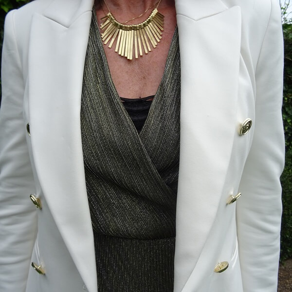 Nancy, I think that this white blazer works well with your golden dress especially with those bold gold buttons. And it’s perfectly fine to reassess life’s priorities every once in awhile and take a step back, whether temporarily or permanently as needed to bring our lives back into balance. Please do take care of yourself.