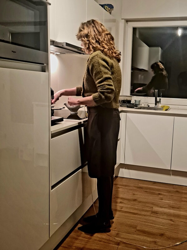 - Me preparing for the fondue wearing the bermudas with slingbacks.