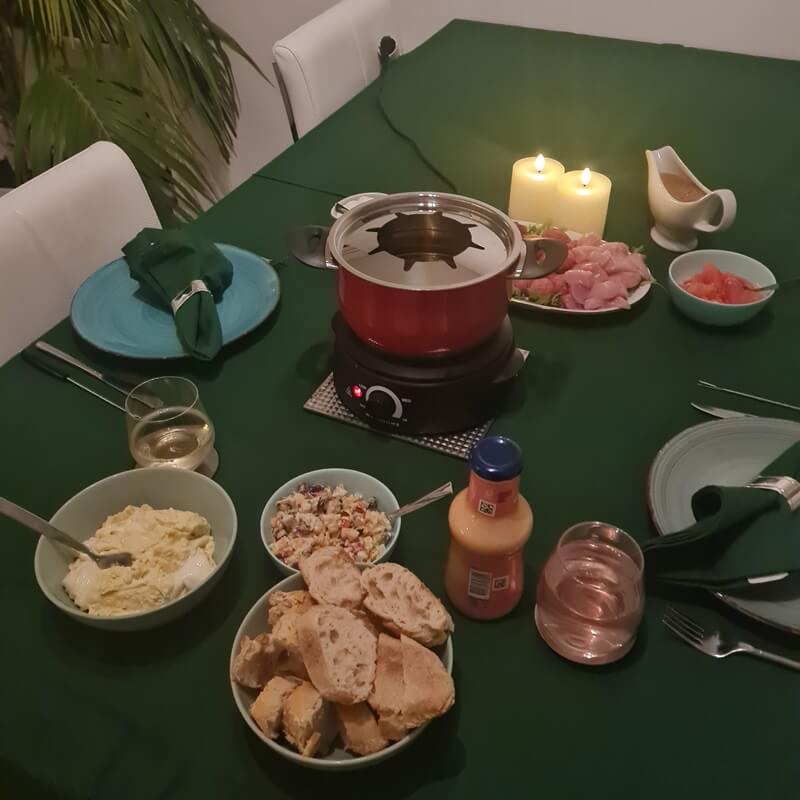 This year we went for fondue. A nice long dinner with a glass of rosé, I love it. Meat fondue this time although we also love cheese fondue. Only organic meat of course and raw vegetables, fruit and baguettes with delicious sauces. I like chicken with grapefruit and cocktail sauce the best. Christmas Day starts always with a nice, extended breakfast with Christmas bread and fresh orange juice and eggs, and of course unpacking the presents!