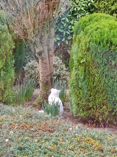 - Neighbor cat watching the birds in the tree, he can’t get in the tree high enough!