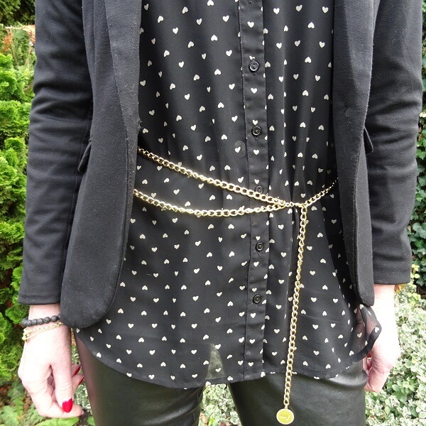 Because who am I to tell you how to wear leather trousers. I am wearing a transparent older blouse with golden hearts and an older blazer. The ankle boots are also years old, but they are so much fun! You see a lot of old in this post! Lol. With gold studs in the shape of a bow. A gold chain belt because I wanted another golden accent, but I wore this outfit to a party and left the belt at home. I love black outfits, and although I now often wear color, I still feel most comfortable in black.