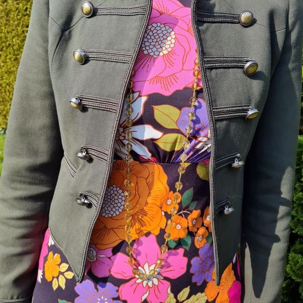 I am wearing a pre loved military style short jacket on this dress. But I think I will wear it a lot with a denim jacket or leather jacket too. Shoes are a bit difficult I think. Not every boots or shoe will look good under this dress. It needs to be a bit neutral I think, or it has to show some skin like sandals. Flashy shoes will be to much, all the attention needs to go to the dress.
