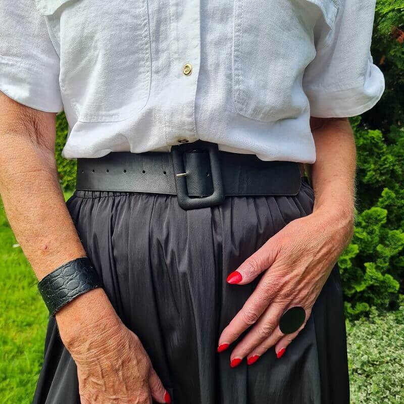 But we will see. Loving these very comfortable sandals. They are a few years old and I don’t wear them a lot. But when I do I feel always surprised that they are so comfortable. I love minimalistic, even the earrings felt to much to me, so I am only wearing a leather bracelet and a black ring.The bracelet is so old that I can’t remember, but so cool. And a few necklaces. A black skirt with pockets doesn’t need much added.