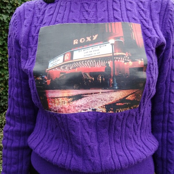 Awesome outfit! I love that shade of purple. But I have never seen a sweater with a photo on it! Fascinating. Another winner, Nancy!