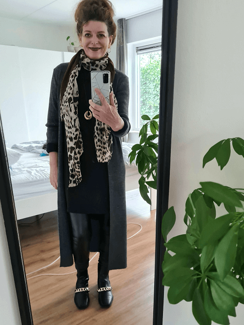 - I wore a new grey long cardigan on a black sheer tunic and leather leggings. And a scarf! Learned from Jodie, who else!