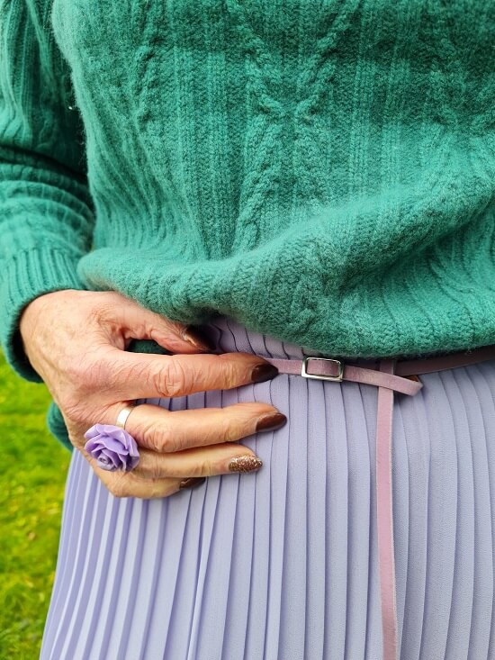 So I do it the other way around, green from above and lilac from below. I was just struggling with the shoes. You have such a rule (well Nancy, they are ment to be broken) that your shoe color must come back in your outfit or else in the color of your skin. Well, I do think that my shoe color should be reflected in my outfit. But the color of your skin??? I don’t have nude shoes at all and I don’t like them either. But luckely I have this gorgeous pair of green ankle boots, I also have lilac ones that would be perfect too. I selected the sweater from Angel Clementine for an Insta collaboration. What a beautiful color! And wonderfully warm. I really need warm sweaters. Have the feeling I get colder and colder every winter.