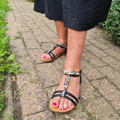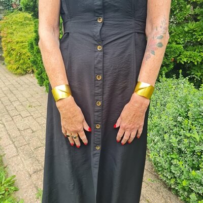 I wanted to wear golden sandals with this dress, but I think I already sold them…. I make decisions to quick, I am very impulsive. And I have often that I regret that I sold something or gave it away. Oh well, that’s life for me. These sandals will do. They feel like wearing slippers, so good. This black shirtdress needs some accessories, so multiple necklaces and golden loops are needed. I am very happy with this dress and my arms didn’t bother me at all. Progress!!