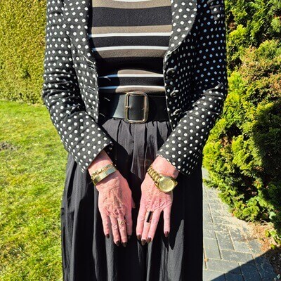 Mixing not only prints up today, but also styles. At least in my head. I was happy when Shelbee choose polka dots for The Thrifty Six for the month of March. Polka dots have something frivolous, something girly, feminine elegance. But I did have the well-known problem. I didn’t have any polka dots in my closet anymore and certainly no pre-loved ones. So, scouring Vinted! Well, it didn’t take long before I came across this great blazer. By Frans Molenaar for C&A. Frans Molenaar was a Dutch couturier. It was another good purchase at Vinted.