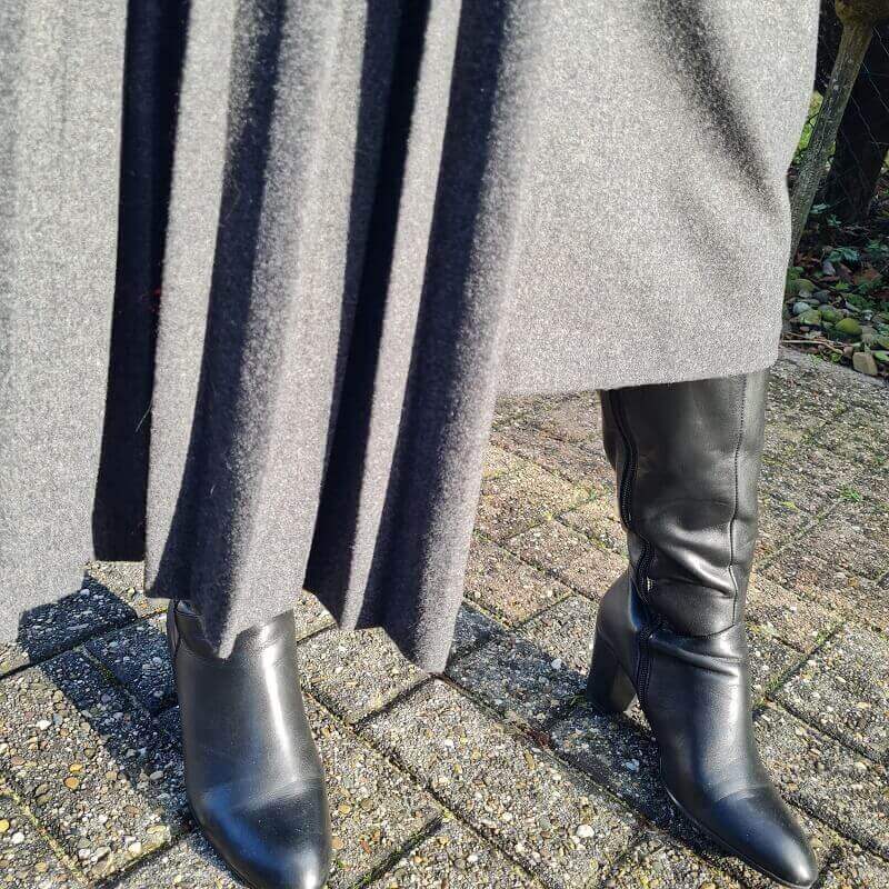 As you might guess, keeping it simple. I like to put some quirky items in the spotlight and keep the rest quiet and simple. This multi-layered skirt belongs in the foreground. And with black, you get that, don’t you? So, a simple black sweater with gold buttons, these are from Zara, they have them in all kinds of colours and wonderful to wear. And leather boots. This necklace looks very nice on this sweater and is just more than enough accessories, and the watch of course, but that is basic for me, just like the earrings. But…..I am learning…….when I am ready dressing myself, I often need to add one more thing (cardigan, scarf, accessories) and here I added two! The bracelets and the ring!