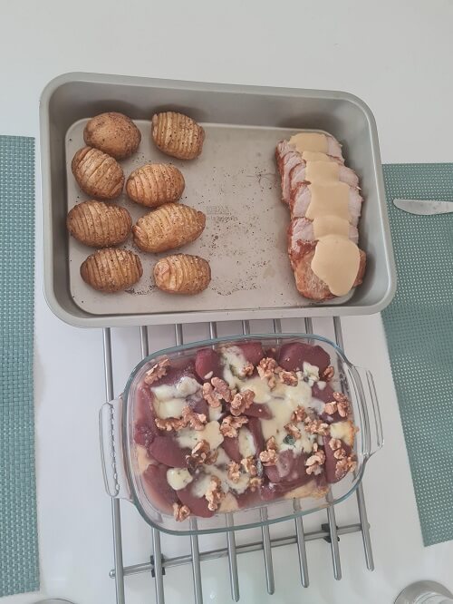 - Potatoes from the oven, stewed pears with Roquefort and walnuts and roulade with mustard sauce.
