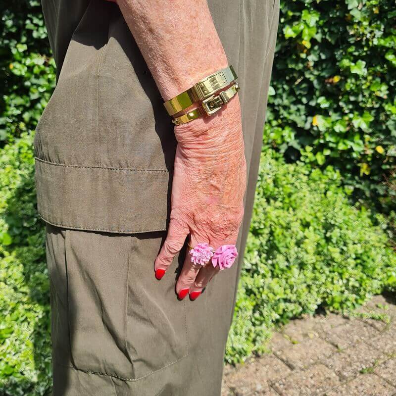 Pink earrings, pink rings and some gold stuff, also gold looks very good with olive green. The sandals are old and never worn……..They are cute and have a very comfortable heel, but my feet look flat in them…..I need to get over that, the sandals are too cute! Stop fussing! But actually, my feet did get flatter over the years. I used to have slim small feet and now I have half a size bigger flatter feet. Gosh, what menopaiuse can do to a woman!