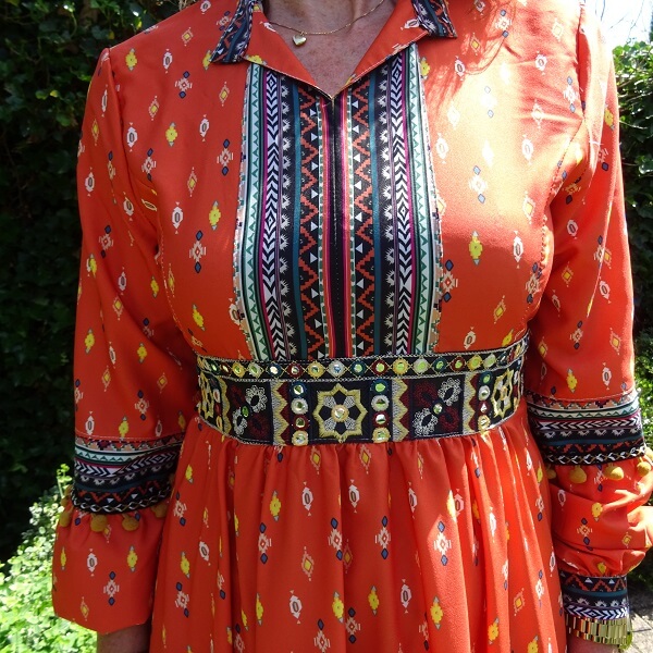 Look at those lovely pompoms at the sleeves and the gorgeous detailing in the waist. This orange dress is such a joy to wear. At the neckline I turned it open but actually it should be worn high. But I don’t like that, at least it doesn’t suit me. I can wear this dress with a jacket too, a biker jacket, blazer, denim jacket, any jacket would look great on this dress.