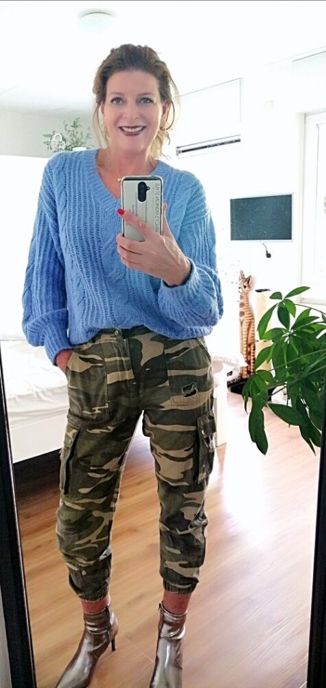 I am loving all your outfits this week, Nancy! The camo pants with the blue sweater look so great together! I have been following the covid news in your part of the world and I have a feeling the U.S. is not far behind on a second serious lockdown. They have been saying from the beginning that we should expect it to be this way for at least 2 years and I don’t think they were exaggerating. Hang in there, my friend. Stay safe and healthy!