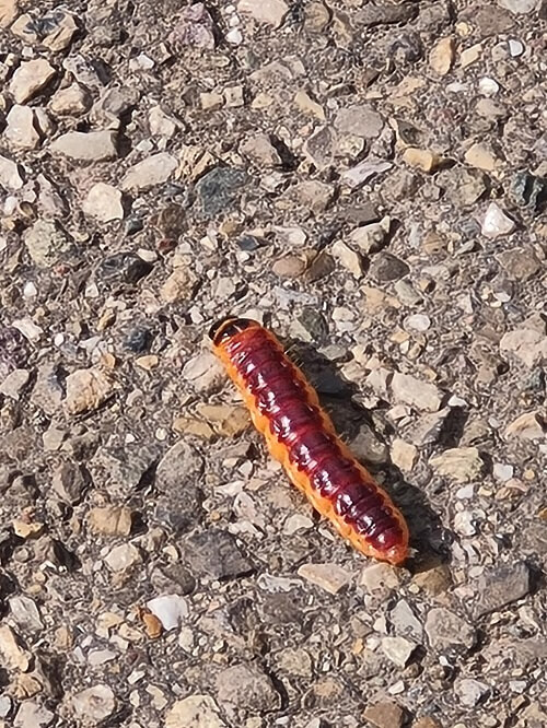- And this huge caterpillar. A very fashionable one, wearing red and orange!