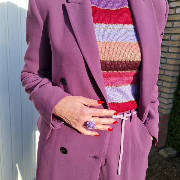 Well you didn’t expect this from me I guess? Color and trousers! In fact, a purple trouser suit! And how beautiful is this one! Totally in love with the color. I showed you a bitv of this suit last Saturday with The Good Buy/Good-Bye Book! I think these are the first trousers I’ve bought since last spring. I don’t like trousers at all, as many of you know. But every now and then I come across one, in this case the color attracted me, of which I think: yes, I think it’s worth it. In fact, I bought two of these trousers. And the other one is a color too! A bit of a lilac one. Oh my goodness, it’s almost to much Nancy….I know!!