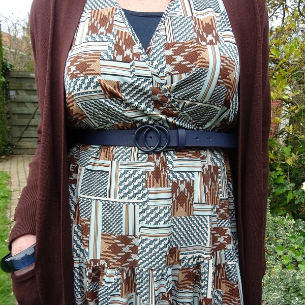 I am very happy with this Shein experience dress. I like the print, the colors are nice and the fit is just right. Actually, I have nothing negative to say about this dress. I wear it with a nice warm cardigan and a belt to create some waist. Although that somehow never works out well for me. Because I want to wear the belt a little lower actually.