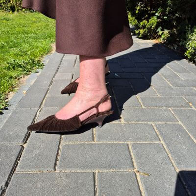 Slingbacks and shine…..and a bit frumpy brown skirt