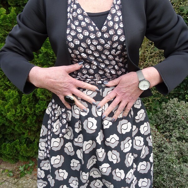 My black Italian boots and a legging. I could have worn tights but I wanted solid black surrounding the dress. And I am wearing a scuba jacket that Tessa made to wear with my custom made dress. My grey nails match perfectly with the grey watch and the statement ring that I also bought in Lewes! Which is a great town to shop by the way as you have noticed by now. In April I hope we will visit it again and otherwise we will in September!