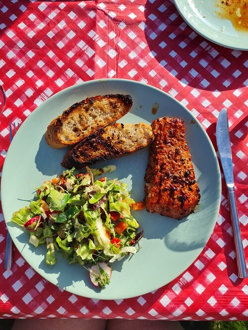 - Peppersteak and salad and bread with oil and garlic, and of course some wine!