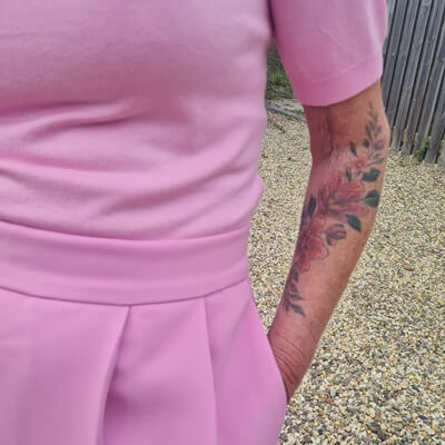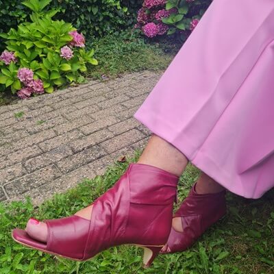 I can only wear this shade of pink if I am a bit tanned by the sun. It’s too light for me, but now it’s good. (I can recommend a online colour analysis to know your colours!) The skirt has pockets which is great. The peeptoes have been around for several seasons. You could already read here that I love peeptoes. Of course, my pink statement ring couldn’t be missed. And the dragonfly necklace. It took a while before I actually started wearing it, accessories are often too much for me, but on such a monochrome pink outfit I think it’s okay! And my tattoo matches perfectly!