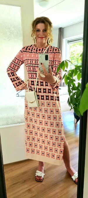 I saw the geometric pink dress on my phone but had to get a better look on my laptop. I think it is just stunning. And I really like that shade of pink on you. Hope you will wear it often and always in good health.