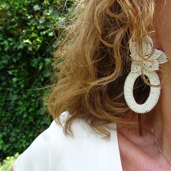The slippers I wear underneath really fit perfectly with a maxi tie dye skirt. I think sneakers would look very good too or other sandals. But I would never wear pumps under a skirt like this. I think that would be very frumpy. On me that is. I chose a white simple tee. Because the skirt, in my eyes, is already eye catching enough, I wanted to keep the rest as quiet as possible. Nice white statement earrings and a statement ring.