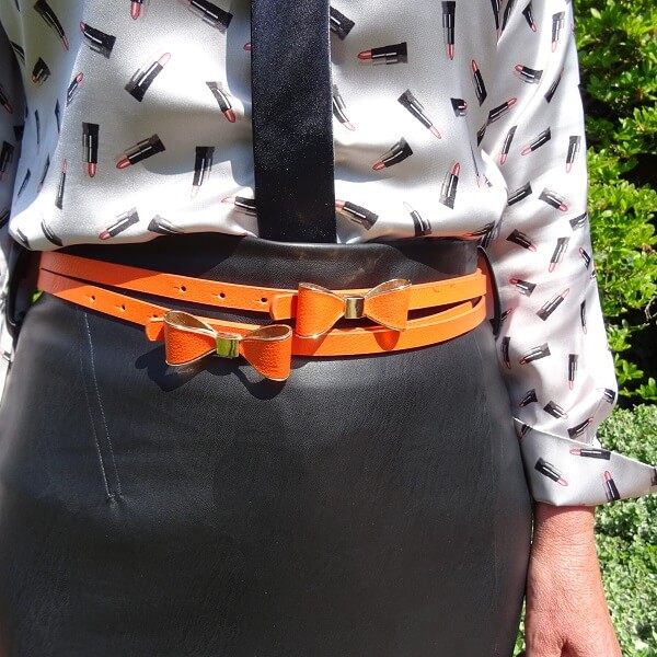 OMG, Nancy, I love this so much! I used to wear ties in high school, too, and still occasionally will wear one. I also cannot stand buttoning the cuffs of my sleeves! The lipstick print on your blouse is so adorable and I am loving your orange bow belts! Thanks for linking up.