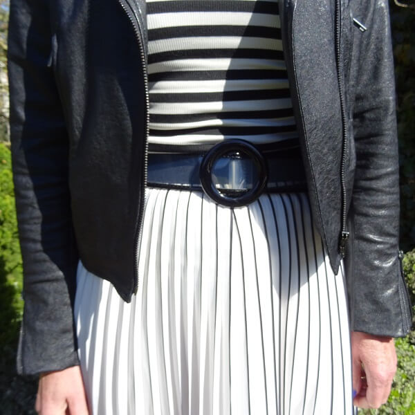 Oh wow, I’m really loving that skirt, Nancy! I love a pleated skirt but this one is extra special with the black accent stripes. And of course, how could you not wear a striped top with it! The black belt and the leather jacket are the perfect finishing touches! xxx