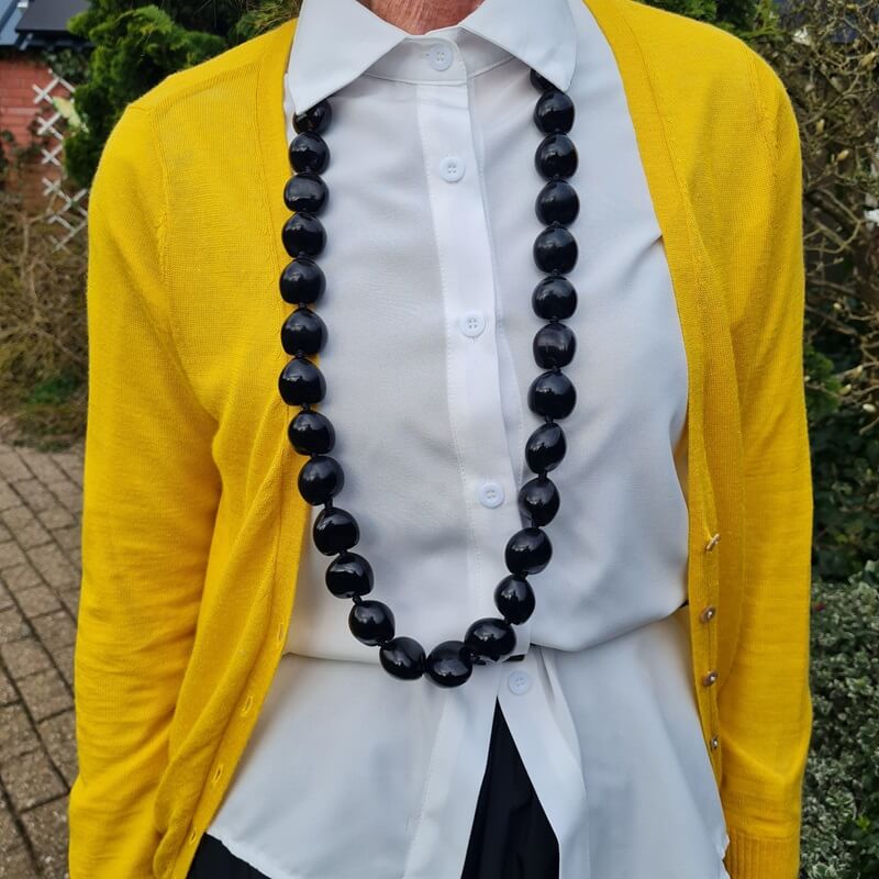So for this outfit I belted the blouse with a black leather belt. I am wearing my fabulous clay black and white earrings and a statement black pre loved necklace. Black ankle boots, but on a warmer day I would wear white sandals.